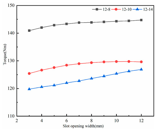 As can be seen from the previous text, the cogging torque and torque ripple harmonics of the motor are largely caused by the slot opening. Therefore, the slot opening width size of the permanent magnet synchronous motor has a significant impact on the motor performance. In this section, the slot opening width size of the motor under three pole slot combinations is scanned and analyzed. Figure 12 shows the average output torque of the motor under different pole slot combinations as a function of the slot opening width.