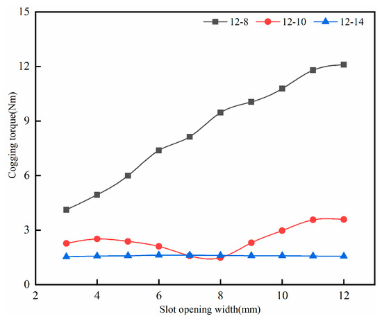 As shown in Figure 12, as slot opening width increases from 3 mm to 12 mm, the output torque of the motor shows an increasing trend under different pole slot combinations. This is because the change in the width of the motor slot has different degrees of modulation effects on the amplitude values of the radial and tangential air gap magnetic density harmonics. Moreover, due to the rich content of air gap harmonics in the fractional-slot studied in this article, the modulation effect of slot opening width on the air gap magnetic density is particularly significant.