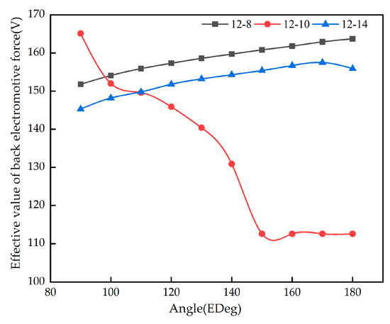 This section conducts a parametric analysis on the angle between the permanent magnets of the motor. Figure 15 shows the output values of the effective values of the opposite electromotive force of the motor at different angles.