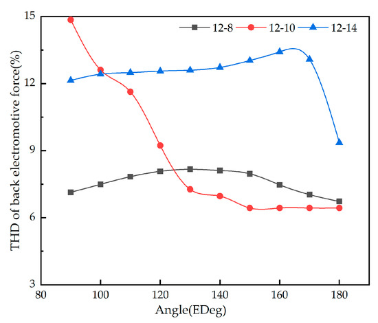 The electromotive force distortion rate of the 8-pole-12-slot scheme and the 14-pole-12-slot scheme increase first and then decrease with the increase of the angle, and their values fluctuate around 13% and 8%, respectively. The distortion rate of the 10-pole-12-slot scheme continuously decreases when the angle is greater than 130°, and the change amplitude is relatively small.