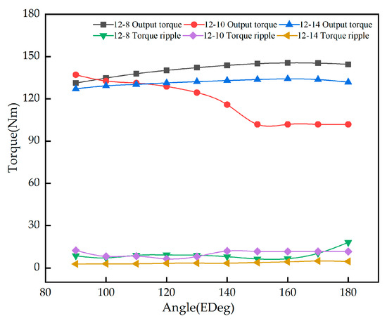 The output torque of the vehicle mounted permanent magnet synchronous motor should not only meet high torque density, but minimize torque ripple to avoid adverse experiences for passengers. The average output torque of the motor is 135 Nm, and the torque ripple is 4.5% at the 8-pole-12-slots, while the average and torque ripple are 116 Nm, 1.2%, 110 Nm, and 2.5% at the 10-pole-12-slots, and 14-pole-12-slots, respectively. Under 8-pole conditions, the average output torque of the motor decreased by 9 Nm compared to the non-skewed pole, and the torque ripple weakened by 55%. Under 10-pole conditions, the average output torque of the motor decreased by 23 Nm compared to the non-skewed pole, and the torque ripple weakened by 72%. Under 14-pole conditions, the average output torque of the motor decreased by 21 Nm compared to the non-skewed pole, and the torque ripple weakened by 16.7%. The average output torque of the motor decreases, but the decrease is small in the 8-pole case, and the decrease is large in the 10-pole and 14-pole cases. Therefore, these two schemes are not suitable for the rotor large angle oblique pole strategy.