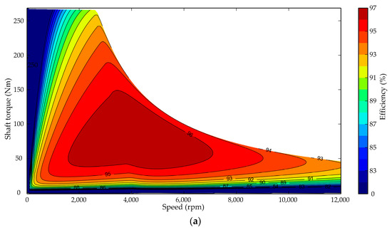 From Figure 18 and Figure 19, it can be seen that there is a significant difference in the output performance of the motor when driven by the same drive currents. Among them, the efficiency in the center area of the 8-pole-12-slot scheme map is greater than 96%, and the peak torque in the constant power area is maintained at 285 Nm. The maximum power occurs at 2850 rpm and the power is 78.5 kW, which is almost equal to the design goal of 80 kW in this paper, meeting the design requirements. The efficiency of the center area in the map of the 10-pole-12-slot scheme is greater than 96%, and the efficiency range is significantly lower than that of the 8-pole-12-slot scheme. The constant power region has been reduced, and the peak torque is maintained at 250 Nm. The peak torque has decreased by 35 Nm, which has a significant impact on the starting stage of the car. The maximum power appears at 2600 rpm and the power is 62.5 kW, which is significantly different from the design target of 80 kW in this article and does not meet the design requirements. The efficiency of the central area in the map of the 14-pole-12-slot scheme is greater than 95%, and the efficiency range is significantly smaller than that of the 8-pole-12-slot scheme. The minimum peak torque in the constant power region is maintained at 313 Nm, and the peak torque has increased by 28 Nm, which has a significant impact on the starting stage of the car. The maximum power appears at 1900 rpm and the power rate is 58.1 kW, which is significantly different from the design target of 80 kW in this article and does not meet the design requirements.