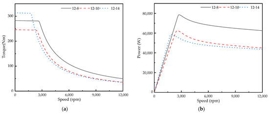 Distribution of motor external characteristic curves under three pole slot combinations. (a) External characteristic curve of motor torque under three pole slot combinations; (b) Electric motor power external characteristic curve under three pole slot combinations.