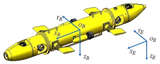 where represents the local position of the ith follower, and is the temporal derivative of the position, i.e., the velocity. is the mass matrix of the ith AUV, and is the acceleration of the AUV. is the external control input torque. represents the restoring force due to gravity and buoyancy. represents the damping coefficient matrix, and is the velocity, reflecting the water resistance’s effect on the motion of the AUV. is a rotation matrix depending on the AUV orientation , used to transform the AUV velocity from the body-stationary coordinate system to the local stationary coordinate system. This implies that the actual velocity of the AUV is obtained by transforming its velocity in the body coordinate system through the rotation matrix. is typically expressed as