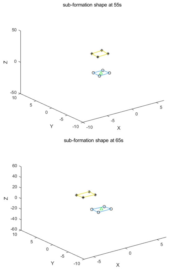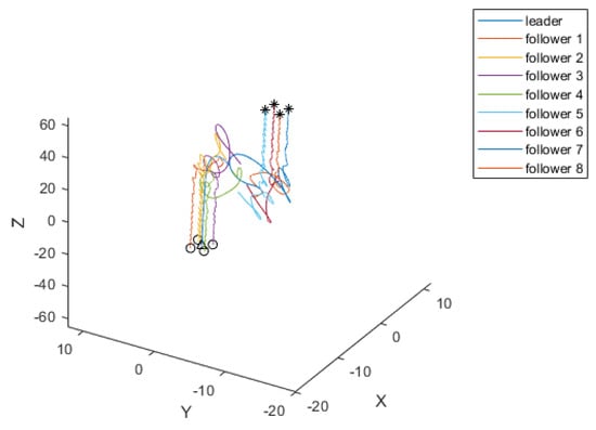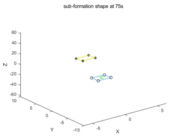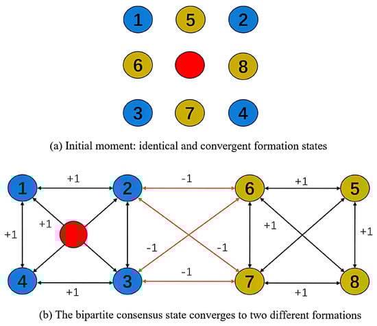 The effectiveness of the designed control scheme for the AUV formation separation task is next demonstrated through numerical simulations. The scenario involves a multi-AUV system comprising one leader and eight followers as illustrated in Figure 2a. The objective is to separate this system into two approximately stable formations, as depicted in Figure 2b, i.e., into