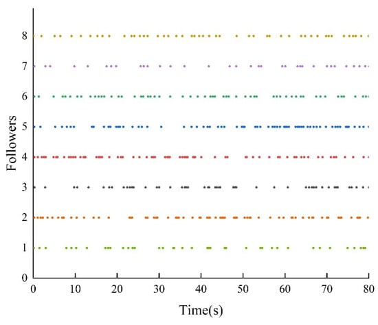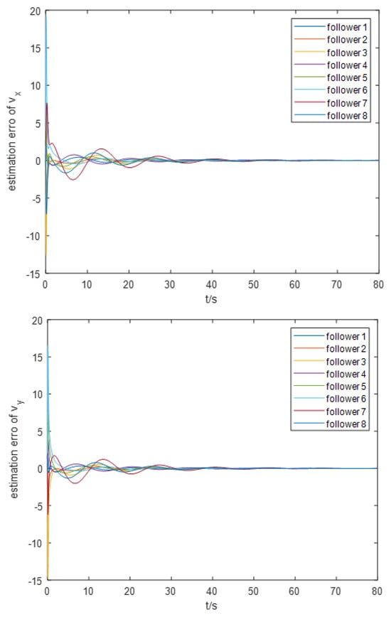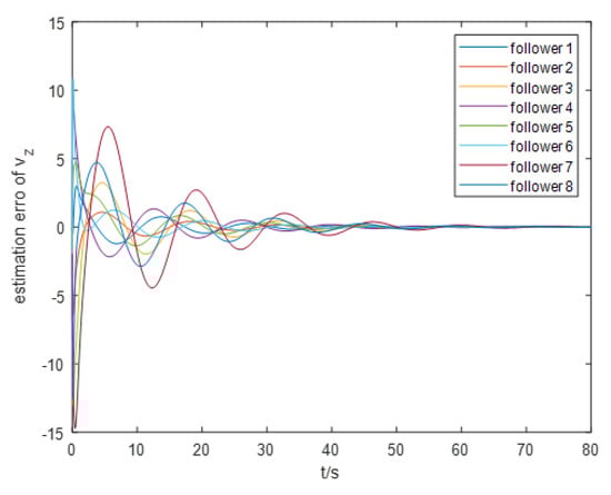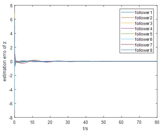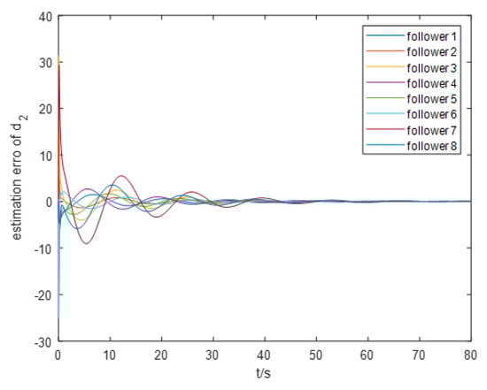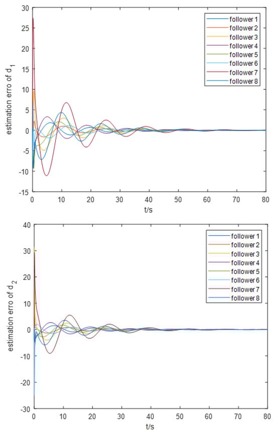 For the event-triggering mechanism, we calculate the parameters as follows: , , , and . The specific trajectory of the formation separation process is depicted in Figure 3. Figure 4 demonstrates the frequency of control input triggers for each AUV during the simulation, demonstrating that the trigger function effectively prevents Zeno behavior. Additionally, as illustrated in Figure 5, the leader leads the two groups of followers into forming two stable rectangular formations. Figure 6 demonstrates the estimation error for the unknown perturbation, clearly showing that the error converges to zero after 50 s of simulation, thus verifying the effectiveness of the extended state monitor. Figure 7 illustrates the convergence of the velocity error for a single AUV during operation, while Figure 8 shows the convergence of the position error for a single AUV during operation, indicating the enhanced performance of each AUV during operation.
