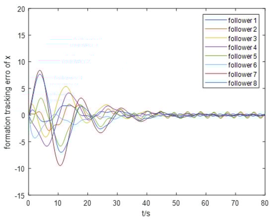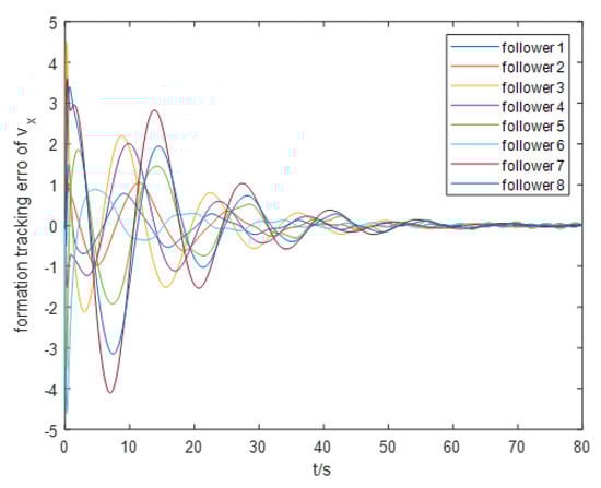 Next, we proceed to examine the steadiness of the overall AUV formation. The formation position tracking error and formation speed tracking error are illustrated in Figure 9 and Figure 10, respectively. It is evident that these two parameters exhibit significant oscillations and slow convergence at the initial stages of the simulation but ultimately converge within a small neighborhood near the origin, achieving asymptotic steadiness. This behavior can be attributed to the insufficient clarity of the formation tracking regulation goals in the previous section. We intend to conduct a more detailed study on the constraints related to these regulation goals in future research.