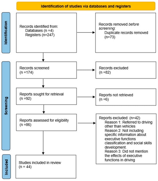The first step in the selection process was establishing eligibility criteria. A list of keywords was created to begin the search in the databases. Boolean operators and different search filters were used to maximize the results. After eliminating duplicate studies (n = 73), the selection process involved screening titles and abstracts to identify studies meeting the eligibility criteria (n = 174). The next stage of the process involved screening the full texts of articles after excluding 82. The remaining studies (n = 92) were thoroughly reviewed. Regrettably, six articles were not able to be retrieved for full-text screening. Two independent reviewers participated in the final selection process. They analyzed the full texts of n = 86 articles and discussed the applicability of the eligibility criteria. A total of 42 articles were excluded for not meeting the eligibility criteria related to not involving driving vehicles, lacking specific details about executive functions, and not discussing the impact of executive functions on driving. The final selection consisted of 44 articles. The results are outlined in Figure 1.