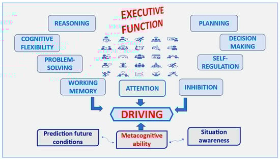 Most activities in our daily lives depend on executive functioning skills. The executive mechanism is an interrelated set of cognitive processes, including planning, attention control, working memory, inhibition, reasoning, problem-solving, and monitoring, that provide humans with adaptability for a constantly changing environment. Executive skills are essential for independent, goal-directed, and self-directed behavior. Driving is a crucial activity in modern society, contributing to a person’s independence and well-being [43].