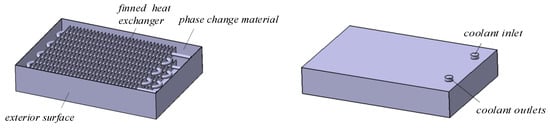 Figure 2 presents a schematic illustration of the configuration of the thermal battery. The finned heat exchanger is situated within the thermal battery and is filled with a PCM. The upper section of the thermal battery casing is outfitted with coolant inlets and outlets, which are linked to the corresponding inlet and outlet of the heat exchanger. The coolant circulates through the heat exchanger, facilitating thermal energy exchange with the PCM, thereby enabling the storage or release of thermal energy. To minimize external heat loss from the thermal battery enclosure, insulation material is applied to its exterior surface. The external dimensions of the thermal battery enclosure measure 410 × 264 × 65 mm, while the inlet and outlet diameter of the finned tube heat exchanger is 10 mm.