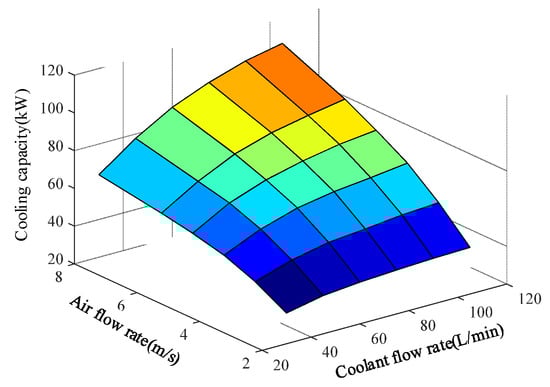 In Equation (13),  is the airflow velocity in front of the engine radiator, m/s. The heat carried away by the cooling air in the engine radiator is related to the heat exchange area of the radiator, and the air volume provided by the cooling fan also has a significant impact on this heat. Based on the parameters of the radiator and cooling fan, combined with experiments, the relationship between different air flow rates and coolant flow rates of the radiator and its heat dissipation capacity is shown in Figure 4.