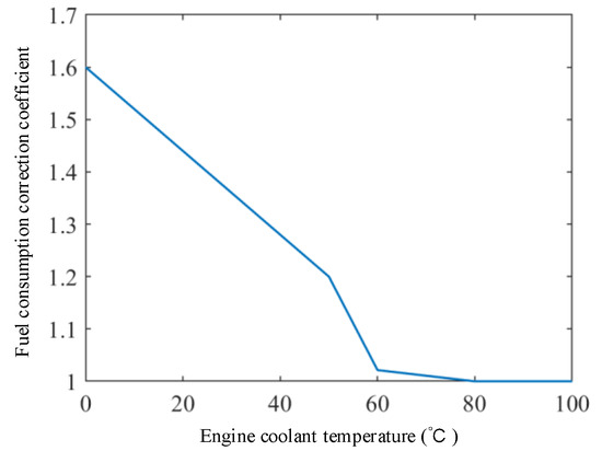 In Equation (14),  denotes the actual fuel consumption of the engine, g/kWh, while  represents the engine coolant temperature, °C. The task involves interpolating the fuel consumption correction factor in relation to the engine coolant temperature. As illustrated in Figure 5. a correlation exists between the coolant temperature and the fuel consumption correction coefficient. The graph indicates that within the coolant temperature range of 0–60 °C, there is a pronounced effect on the engine’s fuel consumption correction coefficient. Furthermore, it shows that as the coolant temperature rises, the fuel consumption correction coefficient consistently decreases until it stabilizes at a value of 1.
