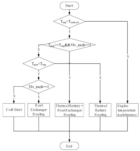 First, determine whether the engine coolant temperature  is lower than the heat exchanger’s set temperature (80 °C). If this condition is met and  is higher than , the three-way valve of the heat exchanger, Vlv-exch, is closed, valve RV1 is closed, valve RV2 is opened, and the system enters the thermal battery heating mode. If  is lower than , the three-way valve, Vlv-exch, is opened, valve RV1 is opened, valve RV2 is closed, and the system enters the heat exchanger heating mode. When the engine coolant temperature  is lower than both the thermal reservoir temperature  and the heat exchanger’s set temperature , the three-way valve Vlv-exch, valve RV1, and valve RV2 are all opened, and the system enters the thermal battery + heat exchanger heating mode. Otherwise, the system defaults to the cold start mode.