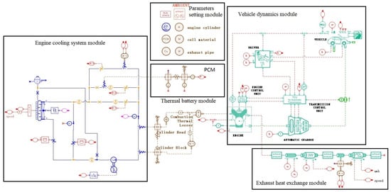In accordance with the structural principles governing the engine’s exhaust heat recovery system, the model developed using AMESim software 2021.1 is depicted in Figure 7. This model primarily comprises the dynamics module, the engine cooling system module, the exhaust heat exchange module, and the thermal battery module.
