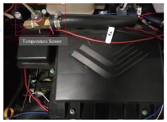 Since this paper primarily focuses on the heat storage of the thermal battery and its role in heating the engine, the accuracy of the engine thermal model is directly related to the precision of the simulation results. To validate the precision of the engine cooling system model, an environmental chamber temperature as low as −20 °C was chosen for the actual vehicle trials (illustrated in Figure 8), with the vehicle operating condition being WLTC. Prior to conducting the experiment, modifications to the vehicle were necessary, primarily involving the installation of a temperature sensor at the outlet of the engine’s water jacket. This sensor was connected to a temperature acquisition card and a controller to facilitate real-time observation and recording of changes in engine coolant temperature post-experiment commencement. The actual installation site of the temperature sensor is depicted in Figure 9.