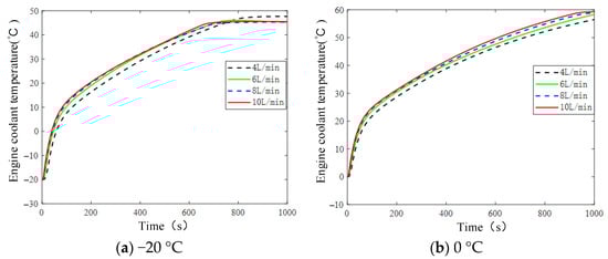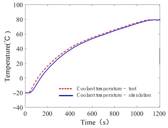 When subjected to an ambient temperature of −20 °C, the comparison between the simulation curve and the experimental curve for coolant temperature during engine warm-up is presented in Figure 10. It is evident that the experimental value of the engine outlet water temperature closely aligns with the simulated value. Throughout the warm-up phase, the simulated engine water temperature exceeds the experimental value, with a maximum temperature differential of only 4 °C; thus, the accuracy of the engine thermal model has been validated. However, since the overall thermal model also includes the thermal battery and the corresponding pipeline models and may vary slightly under different temperature conditions and operating scenarios, there are still certain uncertainties in the simulation accuracy. Nonetheless, as a proof-of-concept study, this model remains valid.