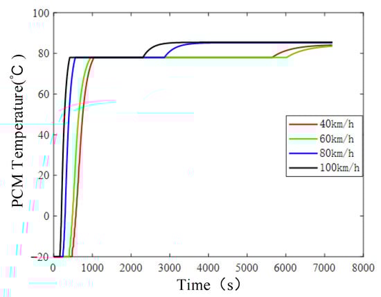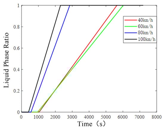 The engine speed, torque, and heat generation of vehicles experience substantial variation under different driving conditions. With the ambient temperature set at −20 °C, the vehicle was operated at consistent speeds of 40, 60, 80, and 100 km/h for a duration of 7200 s, with the average temperature variation curve of the PCM at each speed illustrated in Figure 11. The liquid phase ratio of different speeds during the heat storage process is presented in Figure 12.