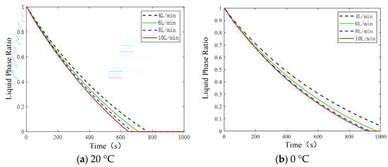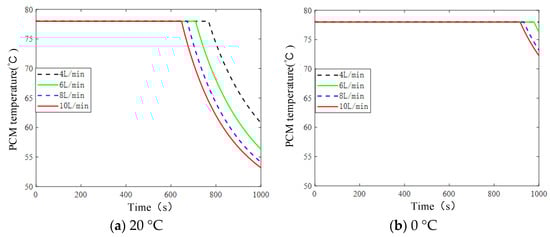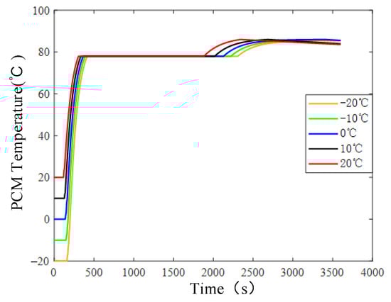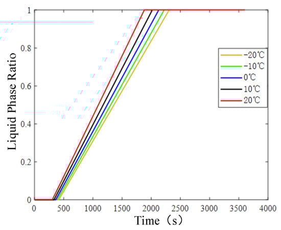 In examining the thermal storage capabilities of a thermal battery during high-speed operation, we have chosen to investigate the impact of ambient temperature on thermal storage performance at a constant velocity of 100 km/h. The primary operational scenarios for thermal batteries typically occur under low and normal ambient conditions. Consequently, this section selects five ambient temperatures of −20, −10, 0, 10, and 20 °C for the simulation. Following one hour of driving, the temperature variation curve of the PCMs is illustrated in Figure 13, alongside the liquid phase ratio of different initial temperatures presented in Figure 14.