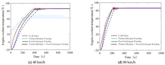 To summarize, among the four-engine warm-up heating strategies, the thermal battery combined with heat exchanger heating mode demonstrates the most effective reduction in engine fuel consumption. At a constant speed of 80 km/h, the fuel consumption savings rate at the conclusion of the warm-up phase peaks at 24.7%.