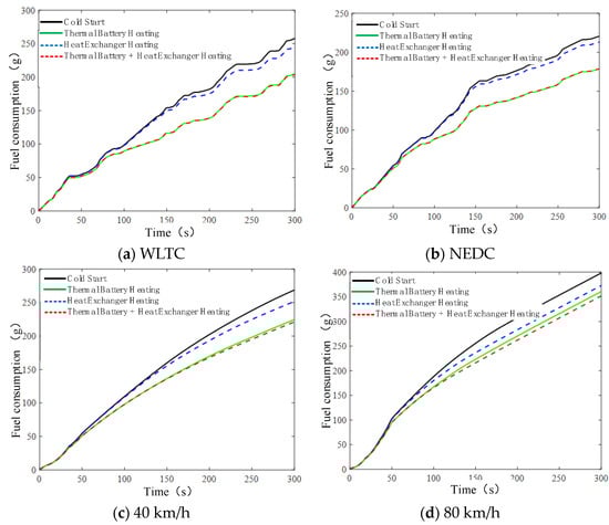 It can be concluded that, under WLTC and NEDC operating conditions, the cumulative fuel consumption during the initial 70 s of exhaust heat exchanger heating closely resembles that observed during cold start mode. The cumulative fuel consumption from 70 s to 300 s is lower than that during cold start mode, albeit with a minor difference. After 300 s of operation, the cumulative fuel consumption during heat exchanger heating under WLTC and NEDC conditions shows reductions of 13 g and 8 g, respectively, translating to fuel savings of 5.04% and 3.62%. In the scenario of combining thermal battery heating and the thermal battery with exhaust heat exchanger heating, the engine’s cumulative fuel consumption during the initial 70 s aligns with that in cold start mode; however, from 70 s to 300 s, the cumulative fuel consumption markedly decreases compared to cold start mode, resulting in significant fuel savings. Specifically, under WLTC and NEDC conditions, the cumulative fuel consumption during the first 300 s of the thermal battery combined with heat exchanger heating mode was recorded at 204 g and 179 g, respectively, leading to savings of 54 g and 42 g of fuel compared to the cold start mode, with fuel consumption savings of 20.9% and 19%, respectively. At a constant speed of 40 km/h, cumulative fuel consumption in the initial 300 s of thermal battery combined with heat exchanger heating mode stood at 269 g, which is 48 g less than that of the cold start mode, achieving a fuel savings rate of 17.84%. Conversely, at a constant speed of 80 km/h during engine warm-up, the cumulative fuel consumption for the thermal battery combined with heat exchanger heating mode was recorded at 253 g, indicating a reduction of 83 g compared to cold start mode, resulting in a fuel savings rate of 24.7%.