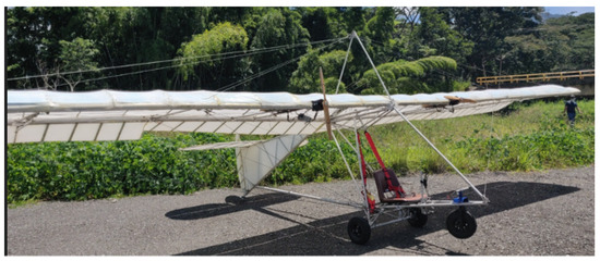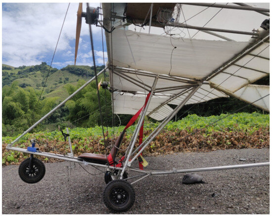 The flight tests of the ultralight aircraft were conducted in Bolombolo (Antioquia, Colombia) on 10 and 31 October 2021. Bolombolo is a small town in the southeast of Antioquia, 61 km from Medellin. Its elevation is 515 m above sea level and features an average temperature of 17 °C. The tests were carried out with a small manned ultralight aircraft that can carry one pilot. The aircraft was built by professors and students at the Institución Universitaria Pascual Bravo in Medellin. The materials used for the structure were aluminum 6061 T6, fiberglass, styrofoam, carbon fiber, dacron, and epoxy resin. The aircraft design was similar to that of an ultralight trike, with a high wing and tricycle landing gear, with a takeoff gross weight of 131.6 kg.