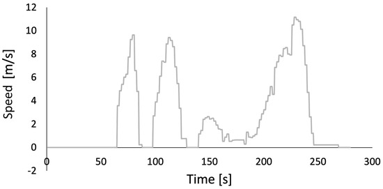 Speed vs. time—the lift-off was achieved at 11.16 m/s in the last peak of the figure.