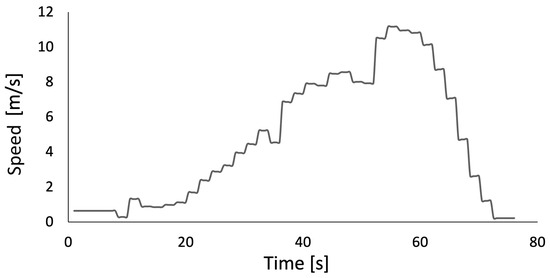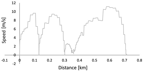The data described below were obtained from the Androsensor application on 31 October at 12:12:30 pm when the aircraft lifted off. This route cycle was undertaken for a distance of 700 m. Figure 4 shows that the speed increased considerably in three specific instances, reaching 9.64 m/s, 9.42 m/s, and 11.16 m/s. At the last speed, lift-off was achieved. Figure 5 shows the speed versus distance traveled on the track. The parts of the runway where the highest speeds were recorded are seen more clearly.