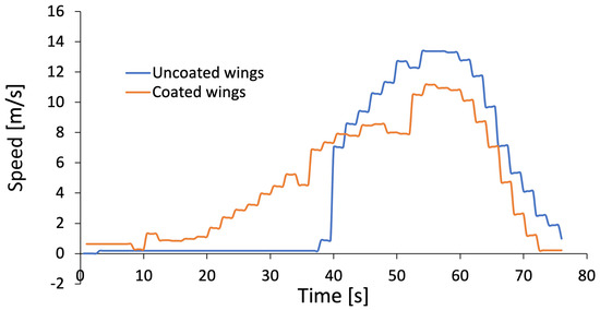 In Figure 4, the first two peaks found reached a speed of 9.4 m/s, which was insufficient to perform the takeoff (with a coating on the lower parts of the wings).