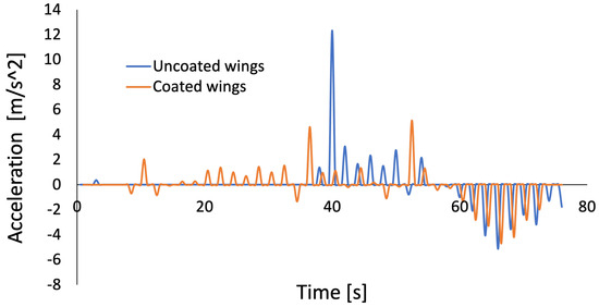 Comparisons of the velocity and acceleration are shown in Figure 8 and Figure 9, respectively, before and after the underwing coating.