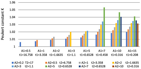 Figure 10 shows the different values for the Peukert constant k found by Equations (1)–(7) and using the data from the Samsung INR-18650-35E lithium-ion cells. The data with the longest time were taken and related to each of the data with the shortest time, giving a total of 36 Peukert k constants. The average of the constants obtained was .