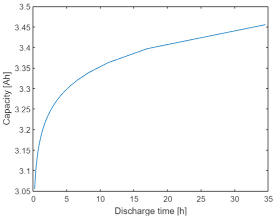 The following cycle was selected to demonstrate how the current change affected the battery’s capacity. At a discharge rate of 0.2 A over 17 h, 3.265 Ah was obtained using Equation (1).