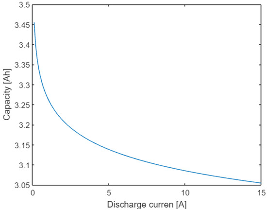 To find the Peukert constant, the experimental data of the lithium cells presented in Table 3 and Equations (1)–(7) were used. Table 3 shows the discharge currents from 0.2 A to 15 A and the respective discharge times for each current.