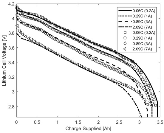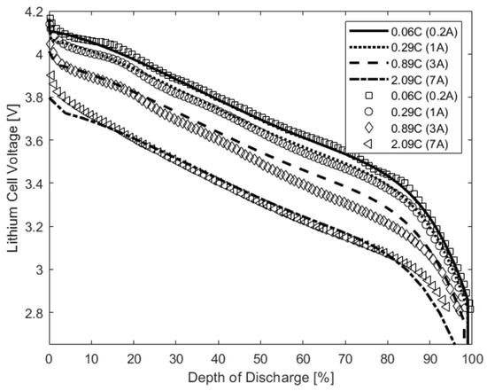 The comparison of the experimental and simulated data was carried out in MATLAB, where the behaviors of the properties of a lithium cell were studied. In Figure 13 and Figure 14, the voltage vs. supplied charge capacity and voltage vs. depth of discharge are shown, respectively. The analysis was carried out for the currents 0.2, 1, 3, and 10 A. The simulations are represented with lines and the experimental data with characters.