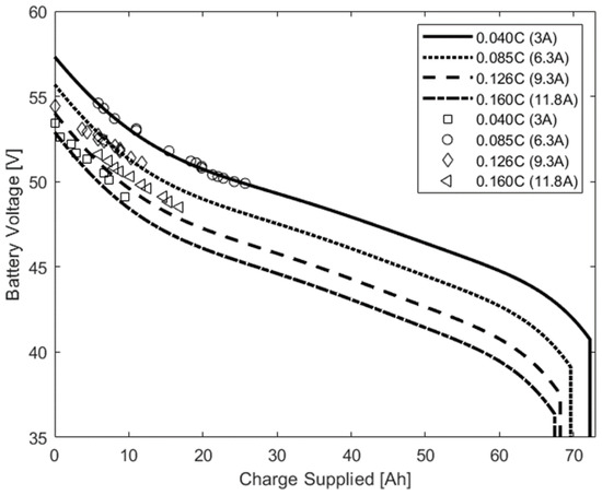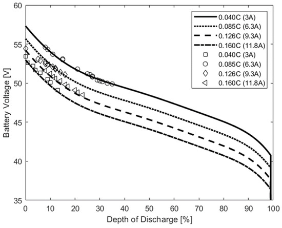 The comparison of the experimental and simulated data of the airplane batteries were carried out in MATLAB. In Figure 15 and Figure 16, the voltage vs. supplied charge capacity and voltage vs. depth of discharge are shown, respectively. The experimental data were taken from Ref. [20]. The analysis was carried out for the currents 1.8, 3, 7.5, and 9.5 A. The simulations are represented with lines and the experimental data with characters.