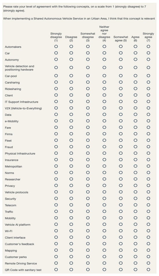 Therefore, a group of respondents was approached to answer a questionnaire built to validate the 35 concepts. The obtained sample comprised professionals acting directly or indirectly in the mobility industry, people who could theoretically participate in the reached digital ecosystem sustaining an SAV service in an urban area.