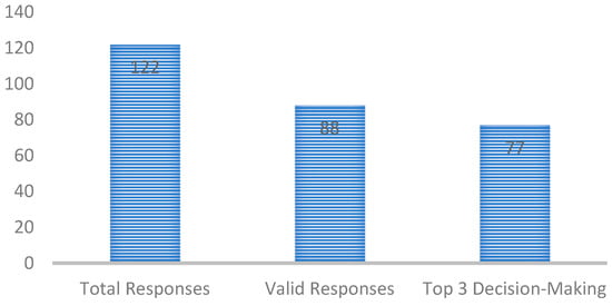 Among the valid participants, 87.5% were male and 86.3% had an age gap between 41 and 60 years. Regarding the nationality of the participants, 68.2% were from Portugal, and a total of 12 nationalities (USA, Brazil, UK, France, Germany, Italy, Mexico, Poland, Portugal, Slovakia, Spain and Turkey) were included in this study. Of the 88 valid participants, 87.5% were in the top three levels of decision making on a scale from 1 (lowest) to 7 (highest). For this study, to ensure that the respondents were undoubtedly people with a strong decision-making capacity, only the ones (77) who confirmed having a level of decision making equal to 5, 6, or 7 (on a Likert Scale of 1 (lowest) to 7 (highest)) were considered (Figure 3).