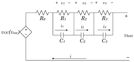The EEC model used is shown in Figure 1 [], which consists of an open circuit voltage that is SOC-dependent and therefore should be estimated online [], a resistance followed by three tanks [], an output voltage , and an input current (i).