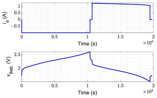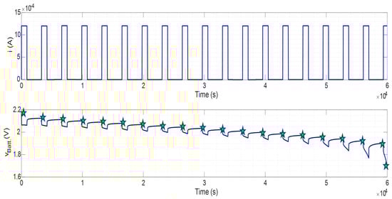Batteries were tested with 0, 25, 50, 100, 150 and 200 aging cycles. For this, the batteries were subjected to a charge and discharge profile that responds to the IEC 60095-1 standard [], as shown in Figure 6. The voltage limits are established according to the discharge characteristics given by the manufacturer, with the maximum operating voltage being 2.24 V and the minimum voltage being 1.8 V [].