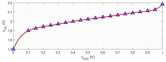 One of the ways to approximate this correlation is through a discharge by controlled pulses until complete battery discharge [,]. Figure 2 shows the pulse discharge suggested. As the discharge pulses are carried out at 0.2 C and the time that each pulse lasts is known, the percentage of charge remaining after each pulse can be estimated. The points marked with a star indicate the value, which better approximates the corresponding located in the voltage stabilization point []. The data obtained allow the approximation of the relationship between the and the , as shown in Table 2 and displayed in Figure 3 in triangles. To proceed with the next stages of the paper, it is necessary to have continuous SOC behavior. To achieve this, a fifth-order function can be used to fit the estimated using MATLAB 2018b. The result is displayed in Figure 3 as a continuous line.