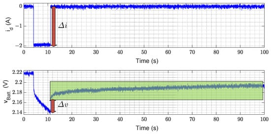 For the EEC model, it is necessary to parameterize , , , , , , and . The method proposed by Plett [] is based on the response to a discharge pulse. This test is illustrated in Figure 4, where the values of and correspond to the instantaneous changes, obtaining the value of using Ohm’s law from these.