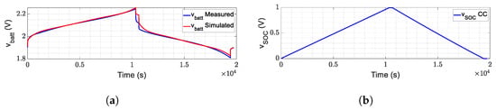 The model response shown in Figure 5 is obtained from the nonlinear model. For this purpose, a charge and discharge cycle at 0.2 C was used in a battery without wear. Figure 5a shows the measured voltage in a cycle, represented by the blue line, and the estimated voltage with the proposed model, represented by the red line, and Figure 5b shows the calculated by CC.