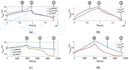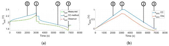 The first thing to validate is the observer behavior in deteriorating conditions and compare it with the model using only Coulomb Counting. For this, Figure 7a shows the battery voltages obtained, and it can be seen that the observer voltage accurately tracks the measured voltage programmed in MATLAB. Figure 7b shows the SOC with both methods. Additionally, Table 4 shows a quantitative comparison of the moments marked as of interest.
