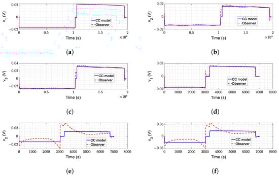 The results show similar trends between the measured and simulated results. However, the values of the resistors and capacitors change with respect to the SOC and SOH variations, which will increase the deviation between the model and actual measurements. To deal with that situation, another approach is formulated in Equation (9) where a model including all the parametric variations along the SOH is established to propose a nonlinear observer whose purpose is to guarantee the process of detecting typical and atypical parametric variations
