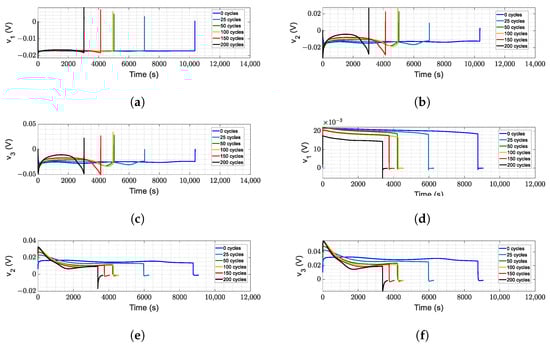 Over-discharge test results of response of the state variables, comparing test results with normal condition aging limits. (a) Voltage in array when charging; (b) voltage in array when charging; (c) voltage in array when charging; (d) voltage in array when discharging; (e) voltage in array when discharging; (f) voltage in array when discharging.