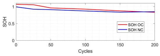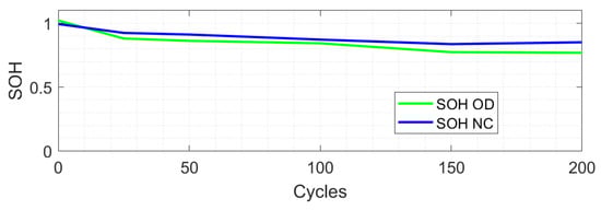 In this case, the SOH advances faster when the battery is subjected to over-discharge conditions, decaying 10% more than the normally aged battery, demonstrating that the SOH can detect this misuse.