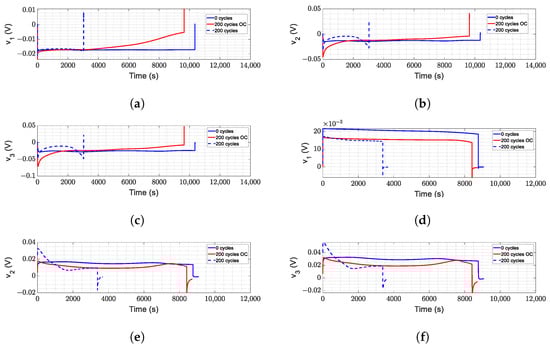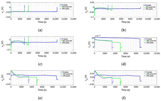 Complementary to the SOH, the responses of the observer’s state variables were analyzed, obtaining Figure 14. The reaction of a battery without aging is shown with a blue line. The response of a battery with 200 aging cycles in conditions recommended by the manufacturer is shown with a blue dashed line, and the reaction of a battery with 200 aging cycles in over-discharge conditions is shown with a green line.