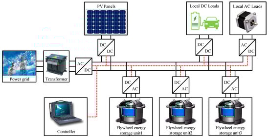 Microgrids (MGs) are small, local, islanded distribution systems that include distributed generation sources (DGSs), storage systems, controllable and uncontrollable loads, and advanced control infrastructure. In the event of grid faults or intended islanding, they can either run independently (island mode) or connect to the electricity network (grid mode) [,]. Integrating renewable energy sources into power grids presents complex challenges due to their inherent intermittency and delayed responsiveness, often leading to discrepancies between energy supply and immediate demand. Energy storage systems (ESSs) have become essential for mitigating these challenges, ensuring grid stability, and maintaining reliable operation. This paper focuses on an FESS microgrid, aiming to enhance its efficiency and stability. The research develops and assesses a PV-FESS DC microgrid system, which includes a flywheel energy storage array, PV generation units, and local load systems [].