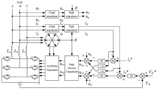 The grid-connected converter adopts a double-closed-loop structure, with the outer loop being a voltage loop used to maintain the stability of the DC bus voltage, and the inner loop being a decoupled current loop, which is used to improve the dynamic response of the grid-connected system and inhibit the overcurrent of the grid-side current. Its control block diagram is shown in Figure 2. Controlling the d-axis current can regulate the active power input to the grid-connected converter and realize the regulation of the DC bus voltage; controlling the q-axis current can realize the regulation of the system power factor.