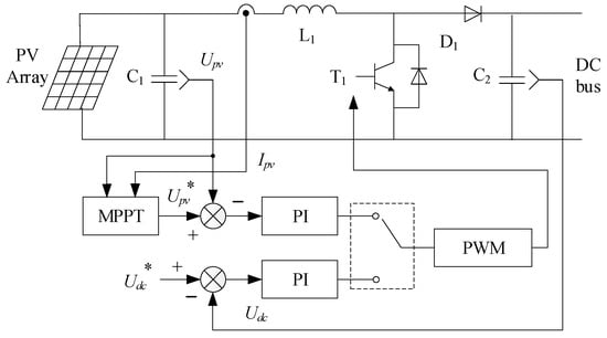 The control strategy for the DC/DC converter in the PV subsystem of a DC microgrid, as depicted in Figure 3, involves connecting the PV array output to the DC bus through a Boost converter. By sampling the PV array’s output voltage, current, inductor current of the Boost converter, and the DC bus voltage, the converter is controlled based on an energy management strategy. This ensures stable operation of the PV system within the microgrid.