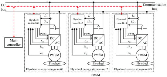 The flywheel energy storage system array employs a unified DC bus architecture, as depicted in Figure 4. Each individual unit within the array possesses identical fundamental parameters and operates independently, maintaining electrical isolation. The controllers of these units are interconnected with the main controller through a communication bus, facilitating the receipt of directives from the central control unit.